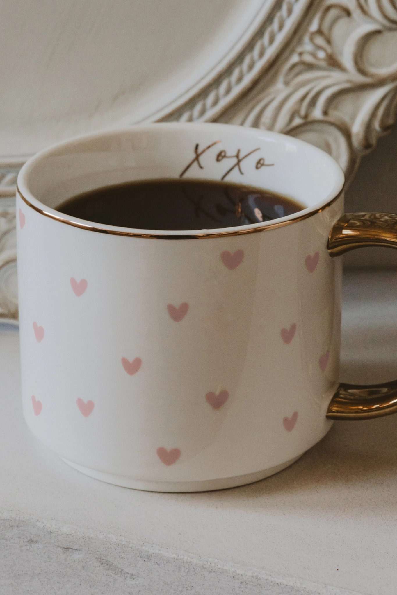 Share a little love with every sip with our Hearts Coffee Mug, featuring a playful heart pattern and a gold XOXO along the inner rim. Perfectly sized for morning coffee or afternoon tea, it adds charm and a touch of elegance to any routine.