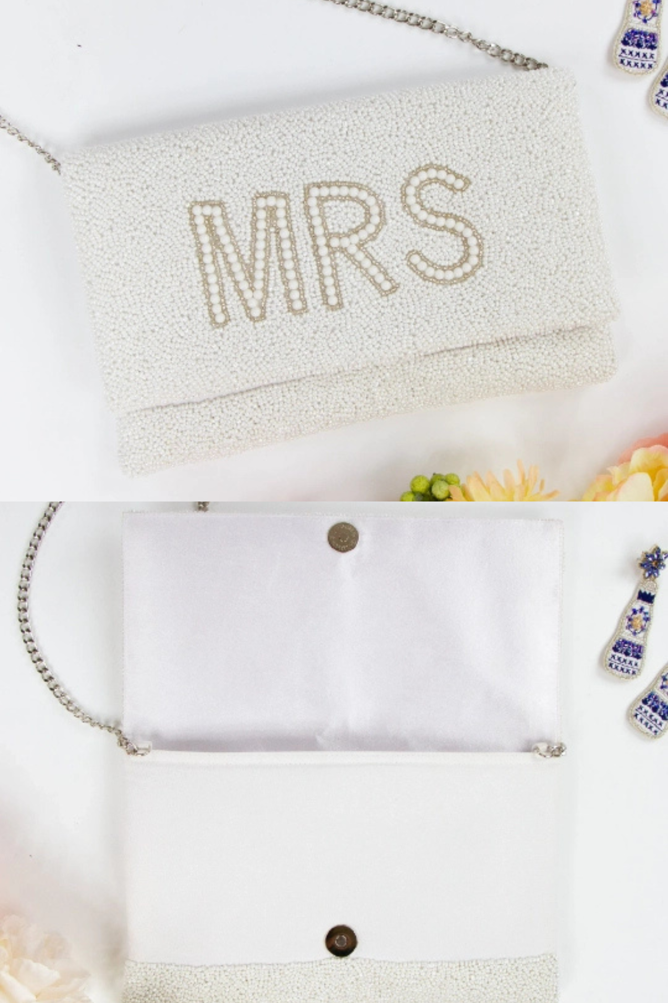 Our "Mrs. Beaded Clutch Bag" is perfect for the bride to wear on her wedding day, honeymoon, bachelorette party, dress shopping, and bridal shower. Buy for yourself or for a friend!
