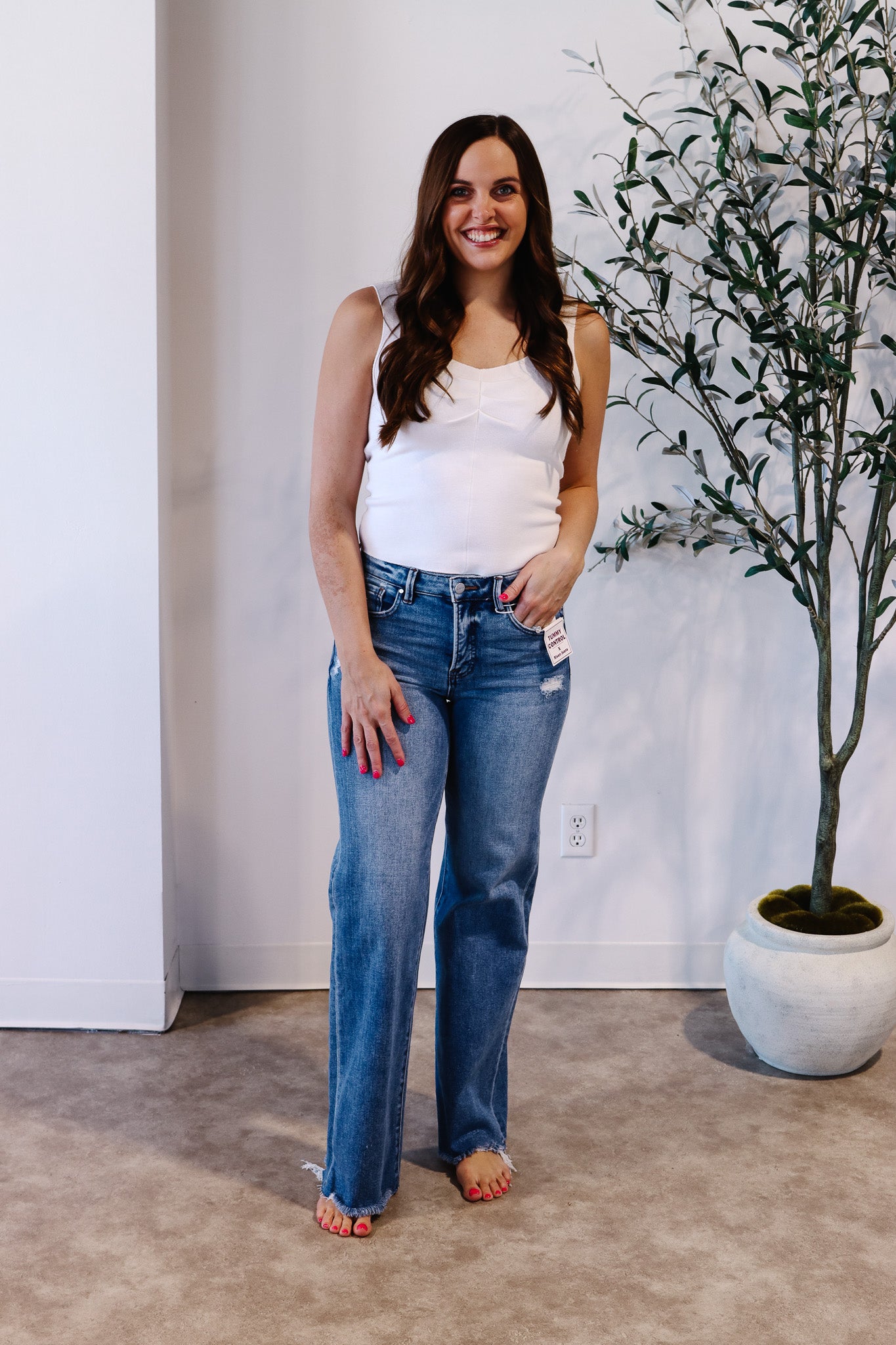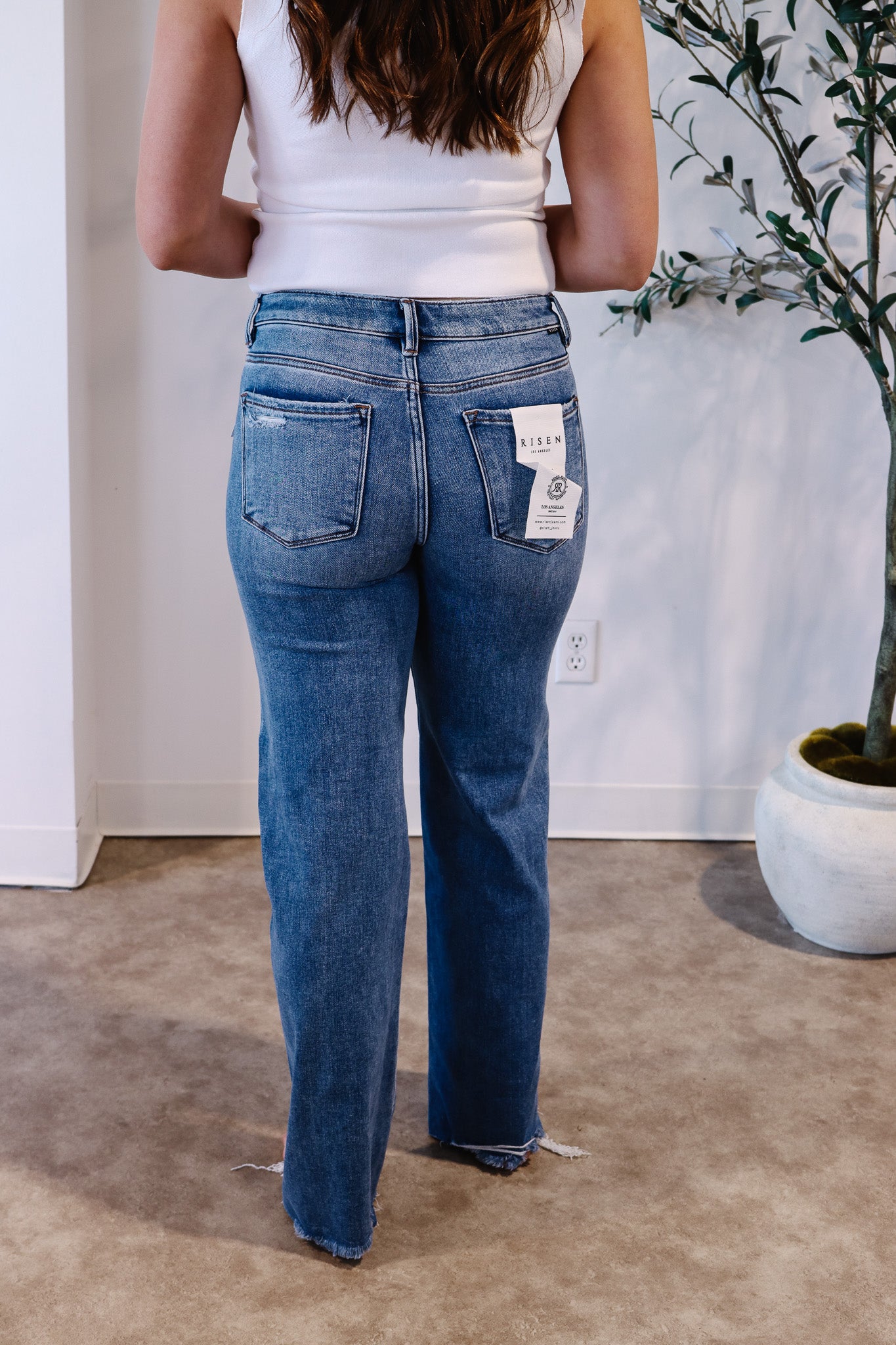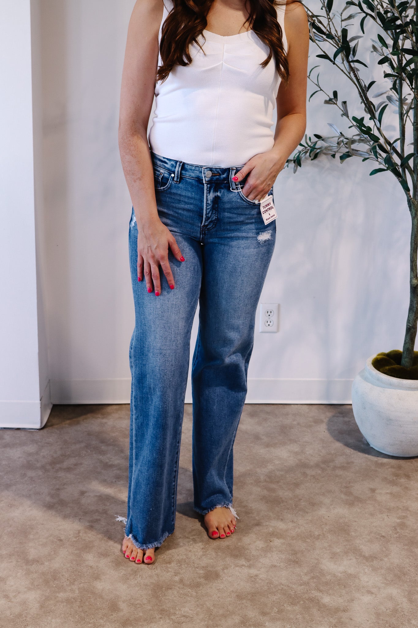 Flattering meets effortless. The Risen Tummy Control Mid-Rise Wide Jeans are designed with built-in shaping that smooths and supports your midsection while keeping a relaxed, easy fit through the leg. The medium wash makes them a true everyday staple, and the wide-leg silhouette creates a long, flowy line that’s both comfortable and on-trend. Finished with a frayed hem for a touch of laid-back edge, these jeans strike the perfect balance between polished and casual — easy to dress up, easy to live in.