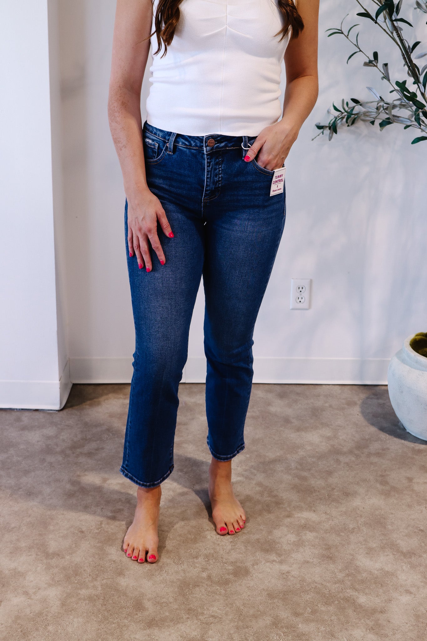 Sleek, sculpted, and endlessly wearable — the Risen Tummy Control High-Rise Straight Jeans are your go-to for a smooth, flattering fit without the distressing. Designed with built-in tummy control, this pair shapes and supports while keeping that soft, comfortable stretch Risen is known for. The straight-leg silhouette creates a timeless, leg-lengthening look, and the clean medium wash makes them easy to dress up or down. From everyday errands to dinner out, these are the polished denim staples your closet needs.