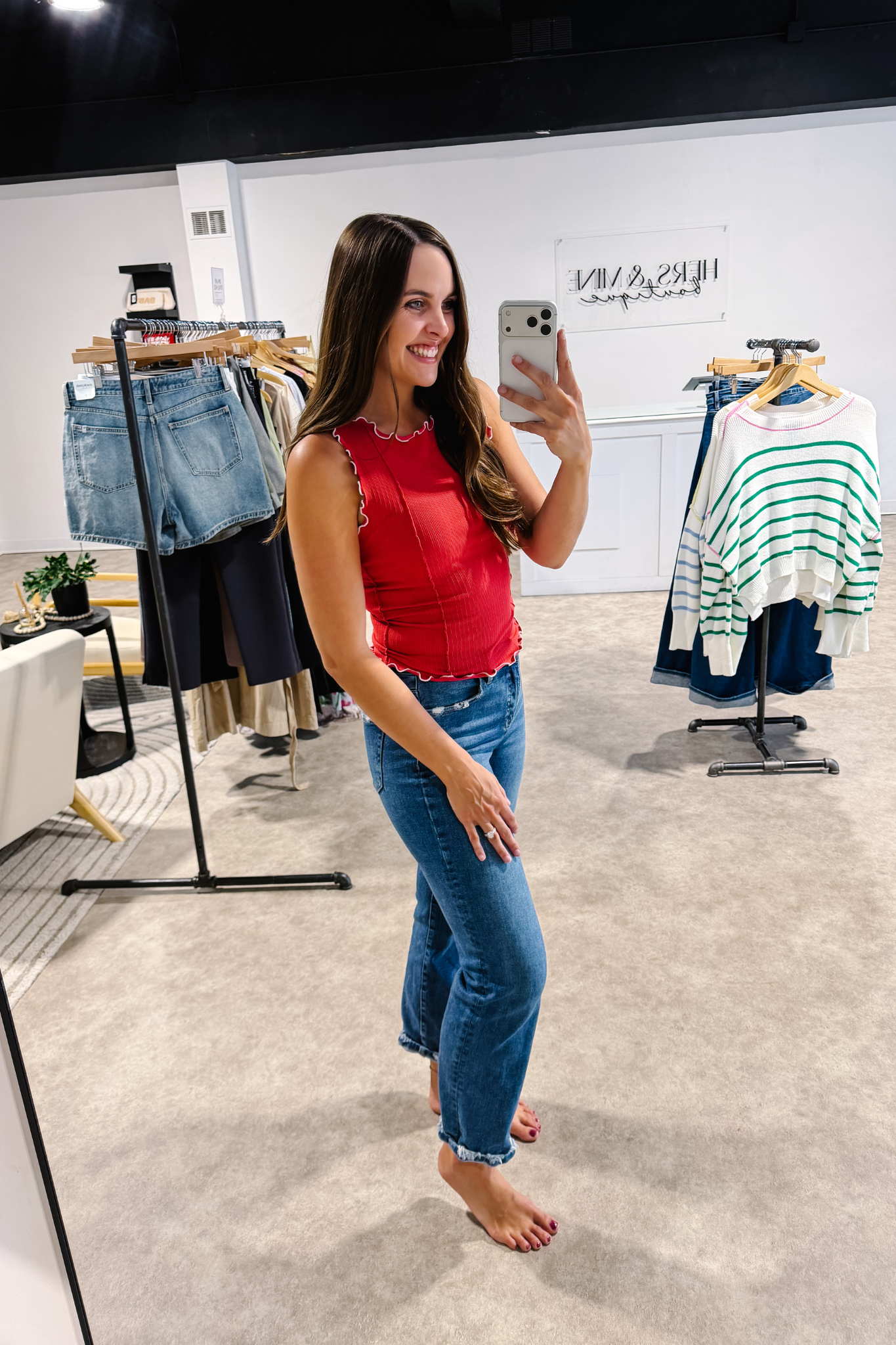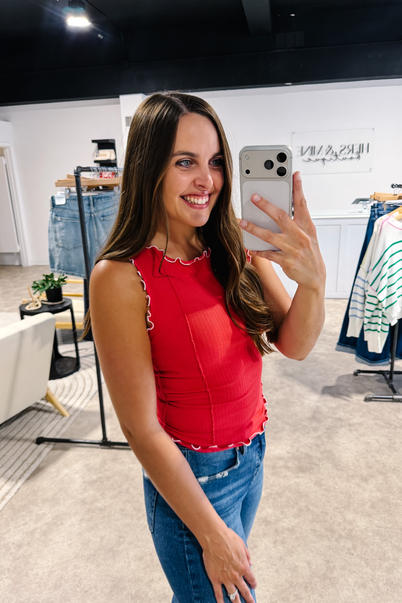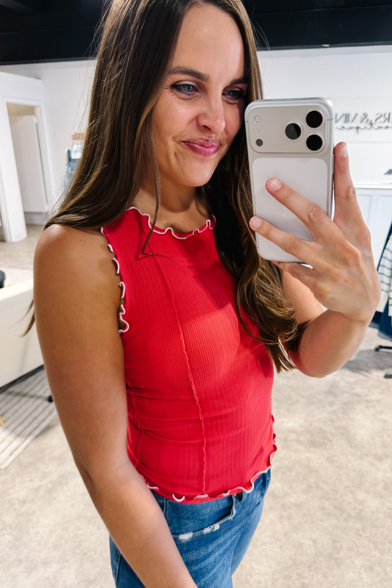 Our Coral Coast Ruffle Tank features a soft ribbed knit with seamless construction for a smooth, flattering fit. Feminine cabbage hem trim along the neckline, armholes, and hem adds a playful touch, while subtle seam details enhance its shape. Lightweight and breathable, this vibrant coral tank is perfect for layering or wearing on its own all season long.