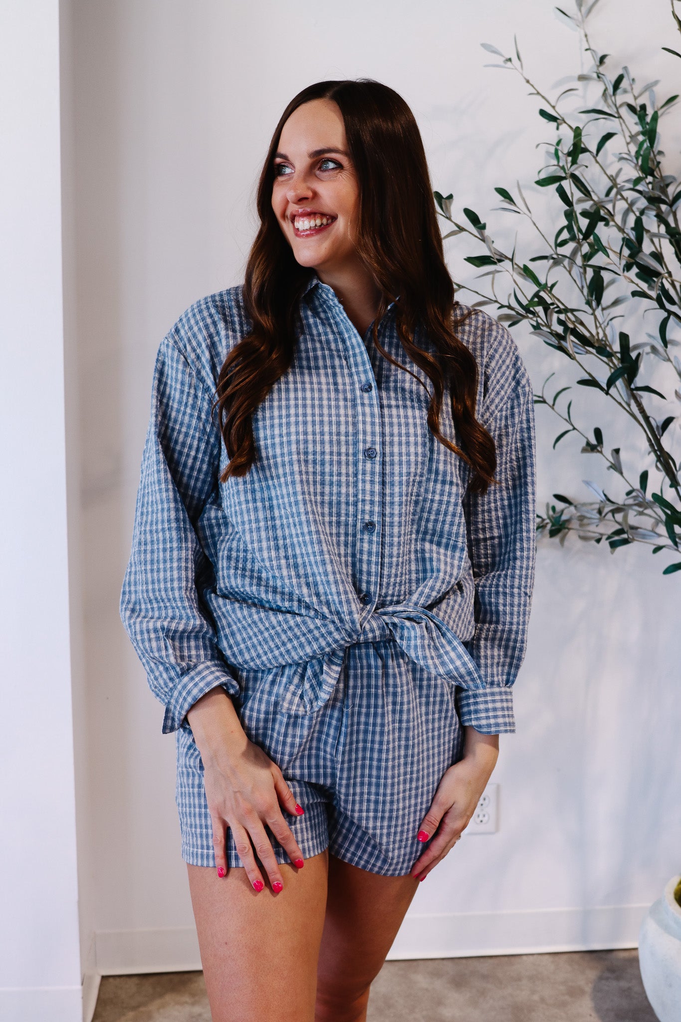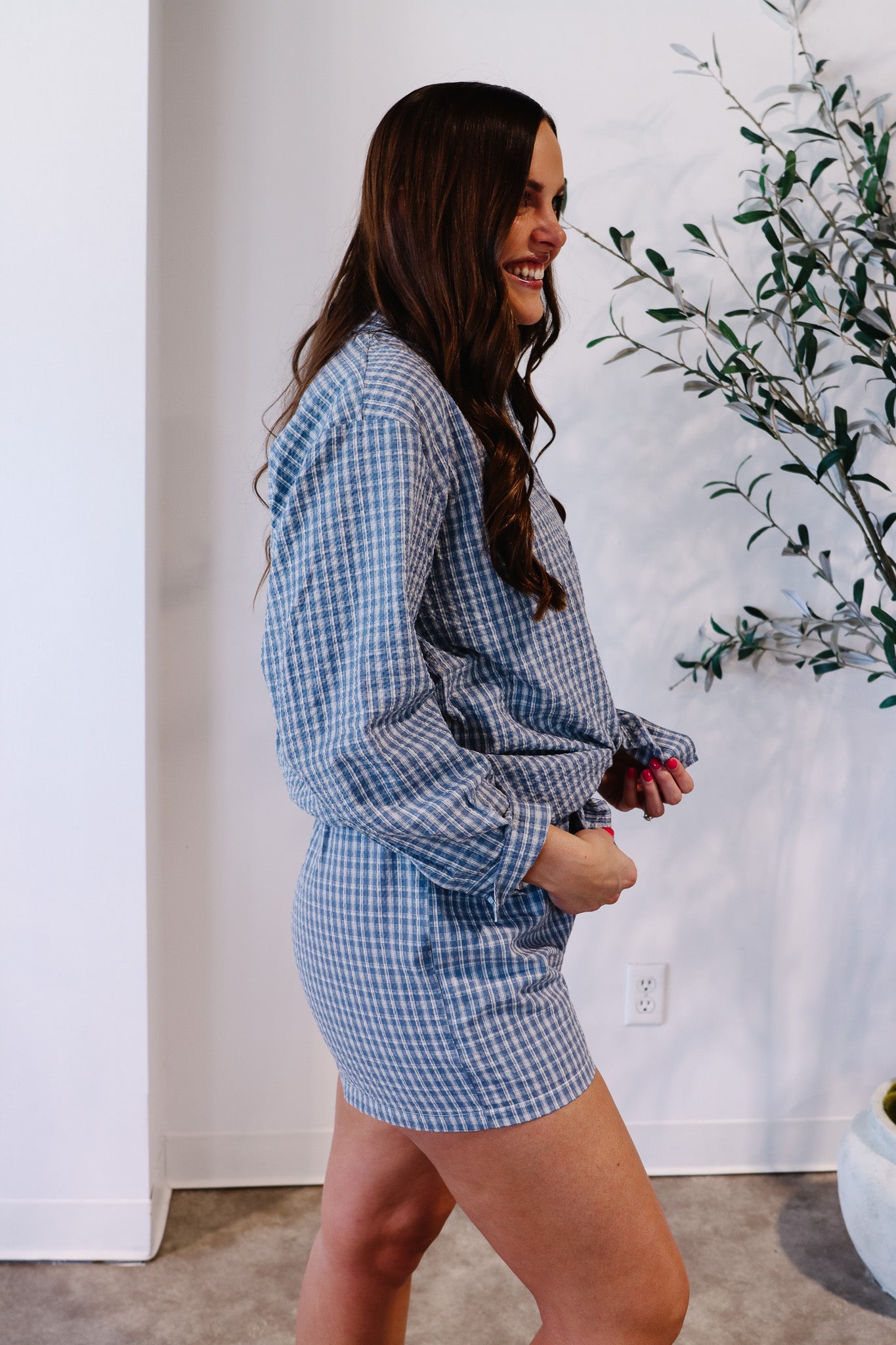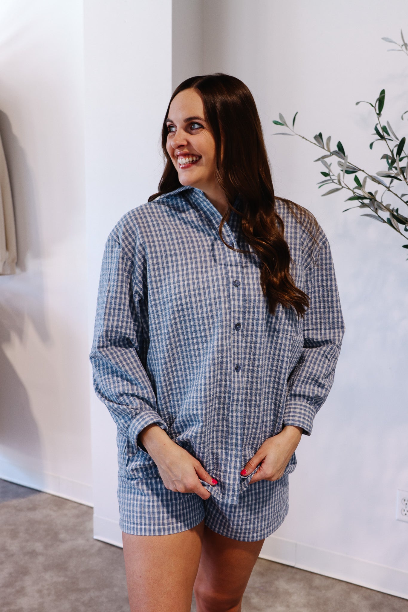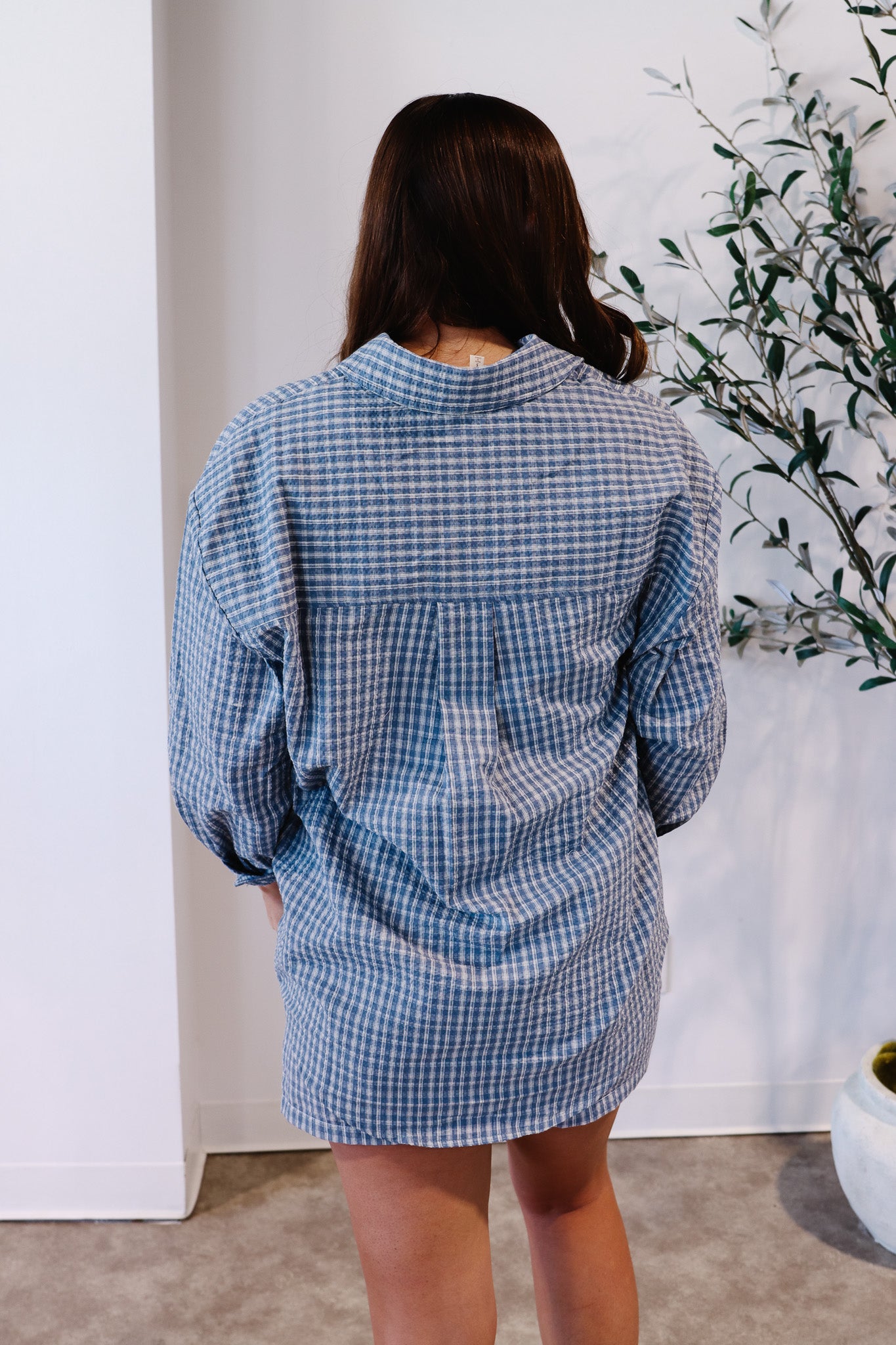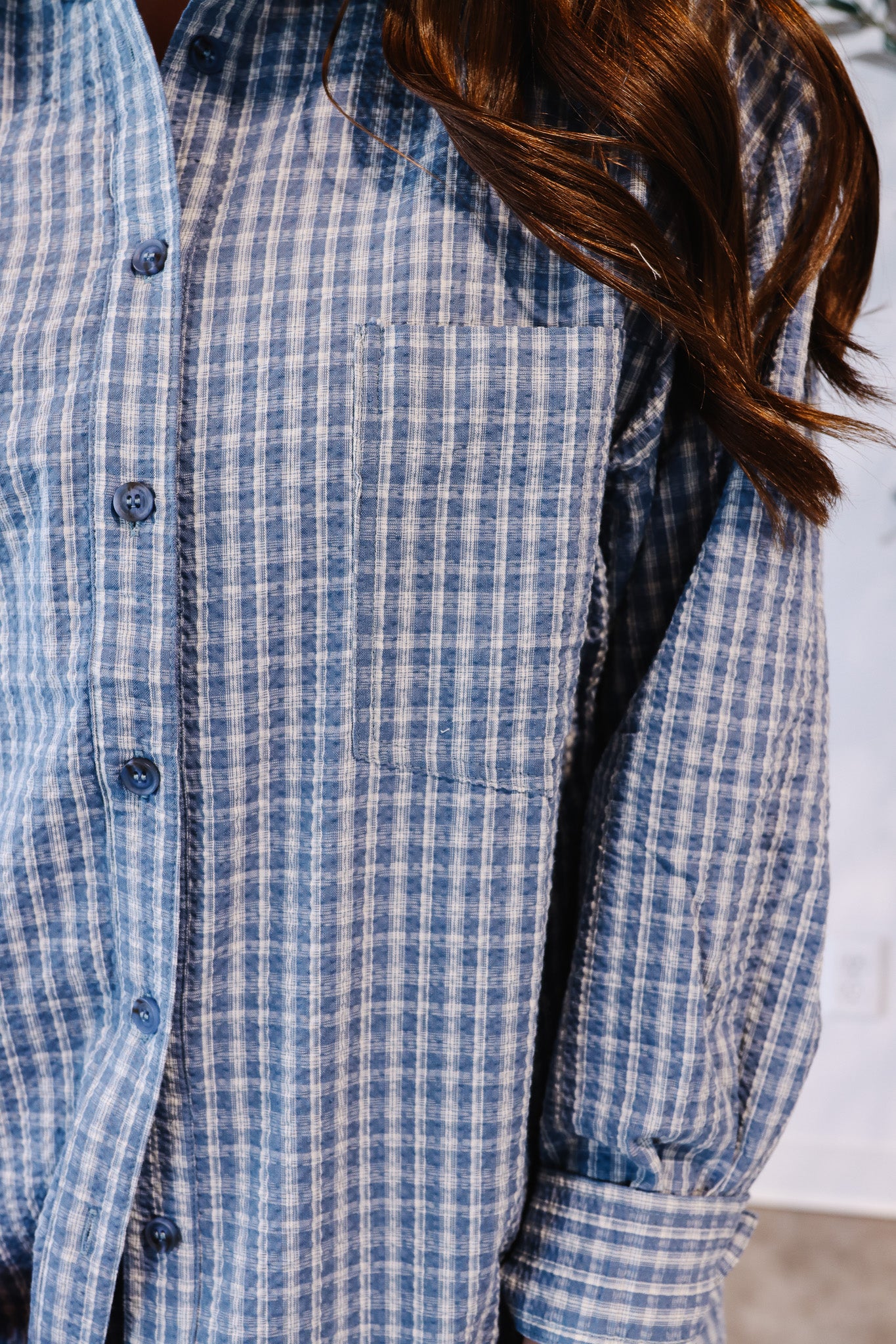 Effortless style meets comfort in this blue plaid oversized shirt, crafted from textured seersucker fabric. Features include a collared neckline, long sleeves with buttoned cuffs, a chest pocket, pleated yoke back, drop shoulders, and a curved shirttail hem for a relaxed, oversized fit—perfect for layering or wearing solo.