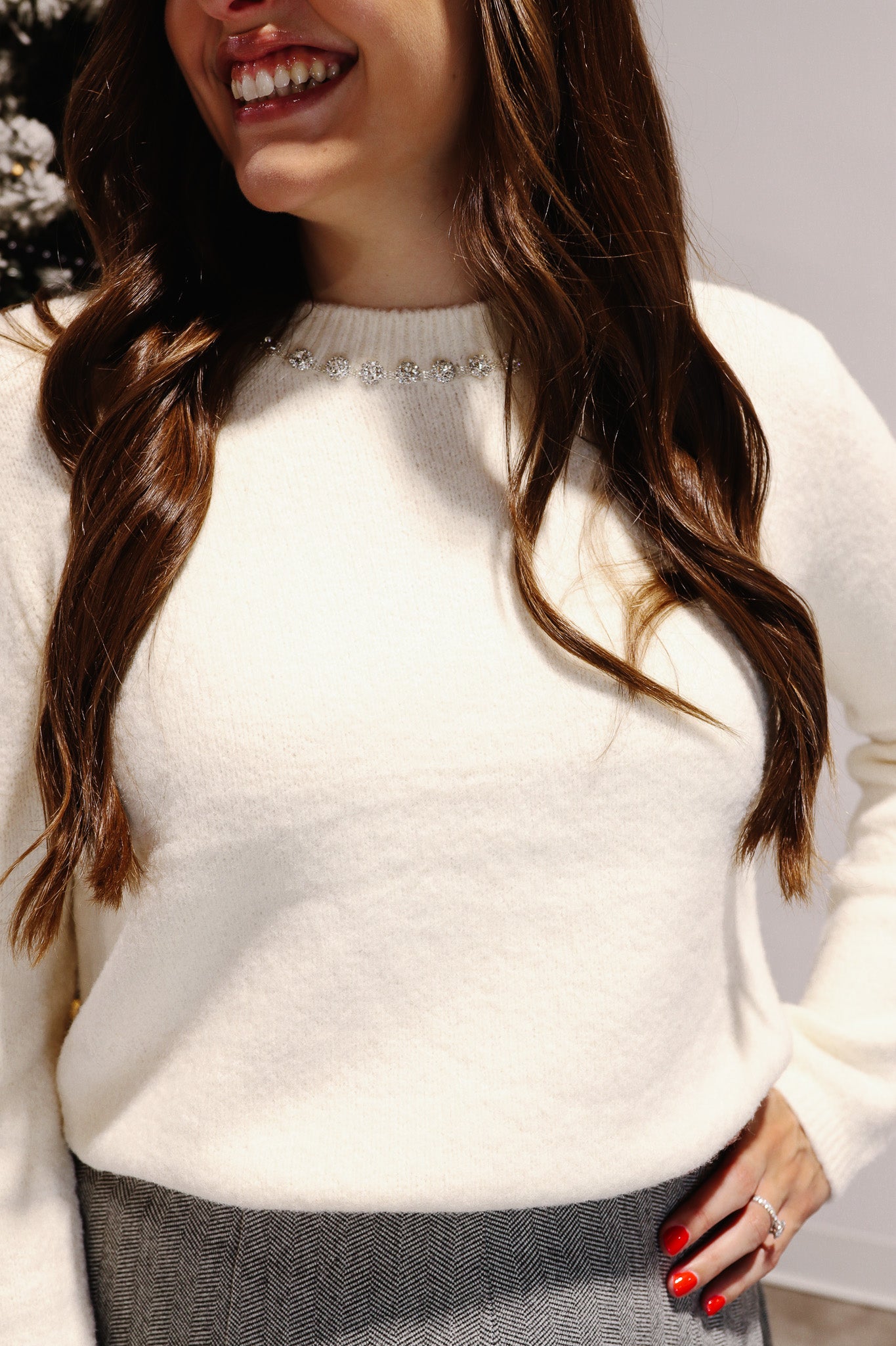 Elevate your holiday wardrobe with this cream sweater pullover featuring a jewel-neck detail and a chic keyhole back. Soft, comfortable, and effortlessly stylish, it’s perfect for layering or wearing on its own for a touch of understated elegance.