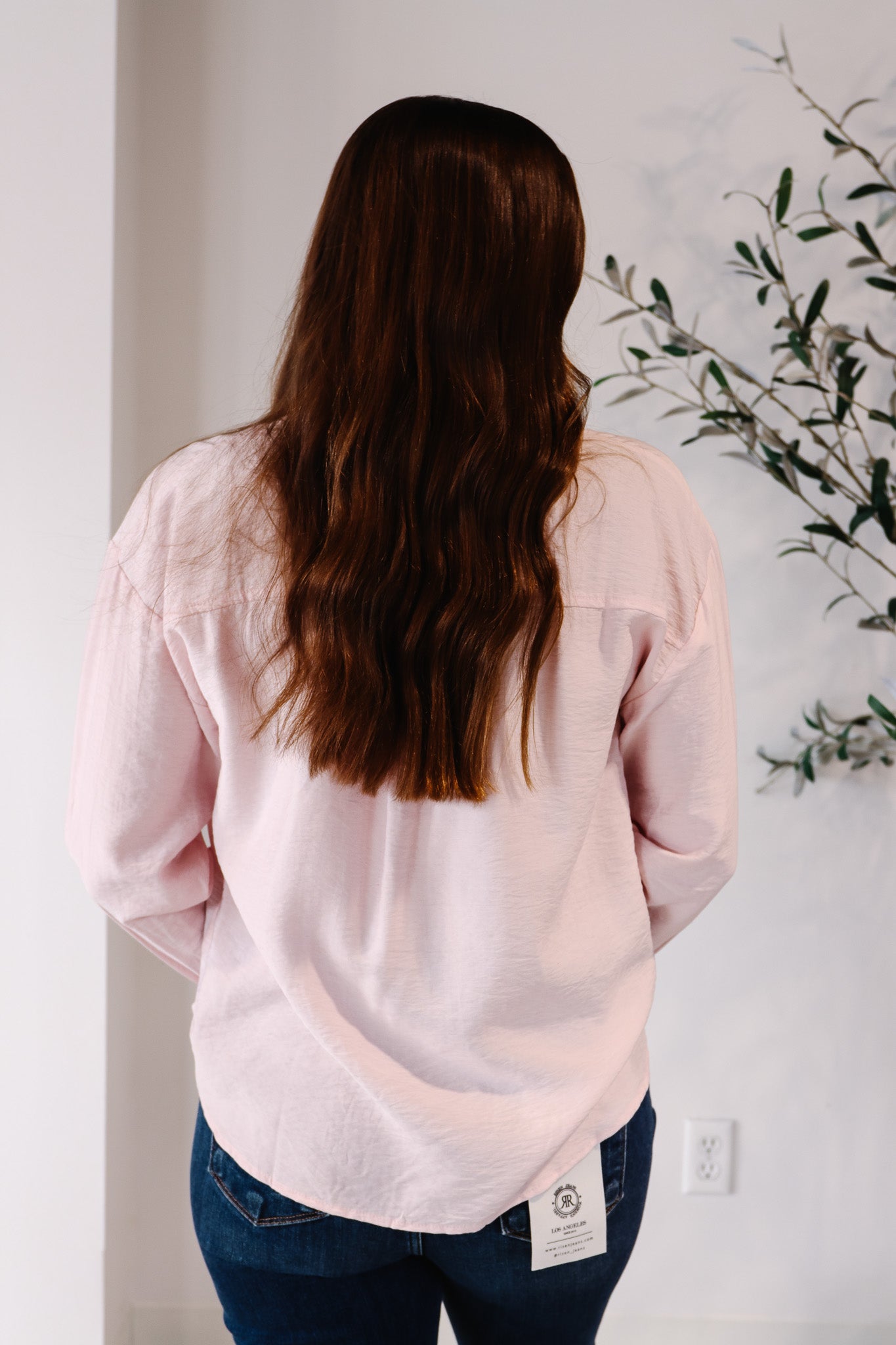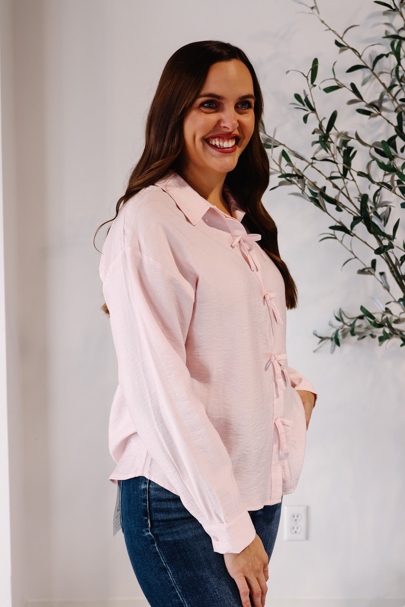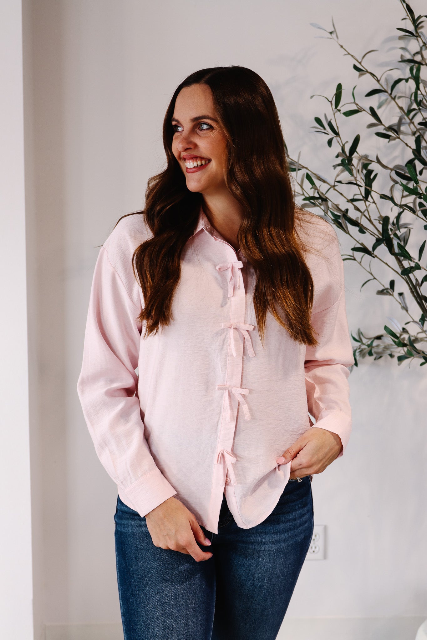 Soft in both color and feel, this light pink linen-blend button-down brings a romantic twist to a classic silhouette. The crinkled texture and ribbon tie accents create an effortless charm, while the relaxed fit, long sleeves, and collared neckline make it ideal for year-round layering.
