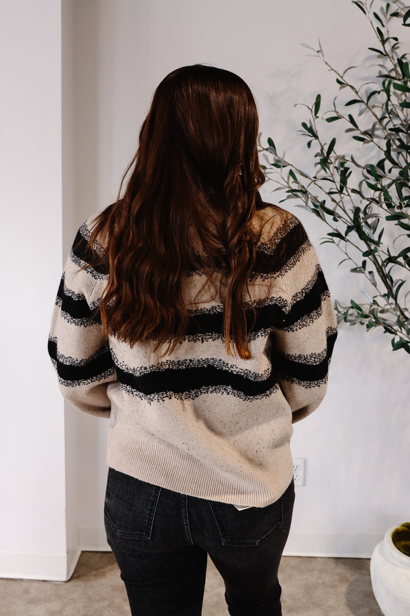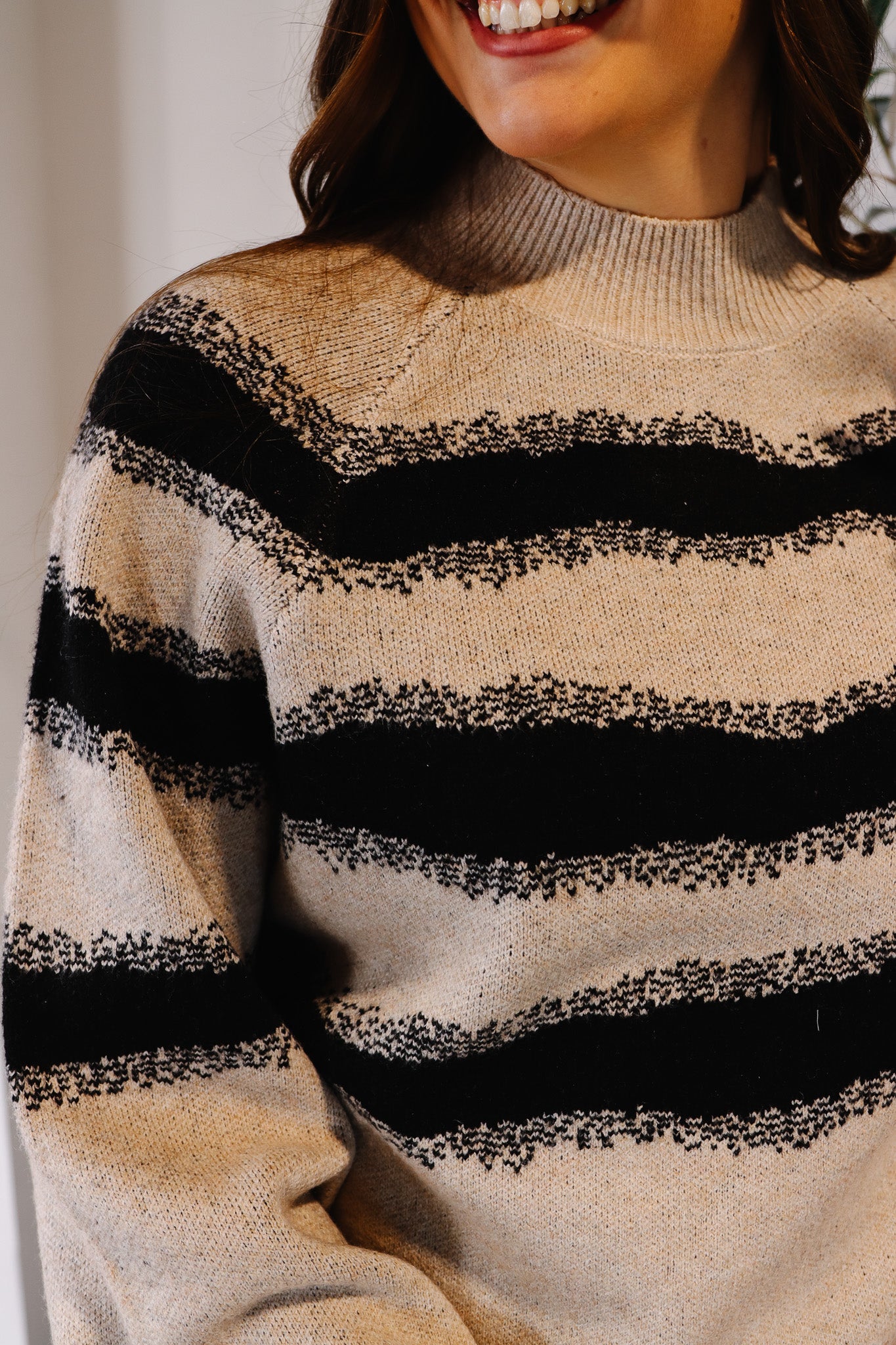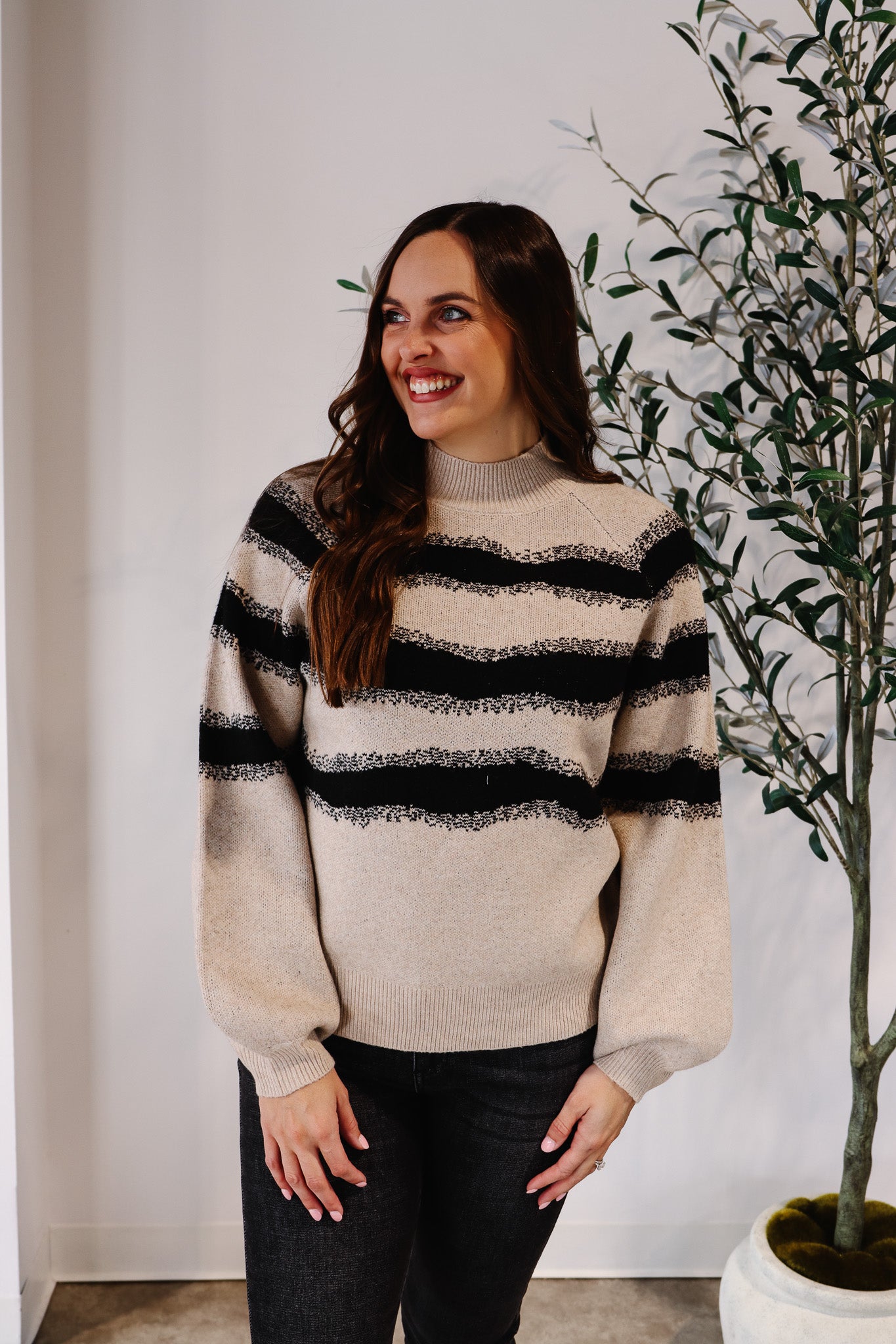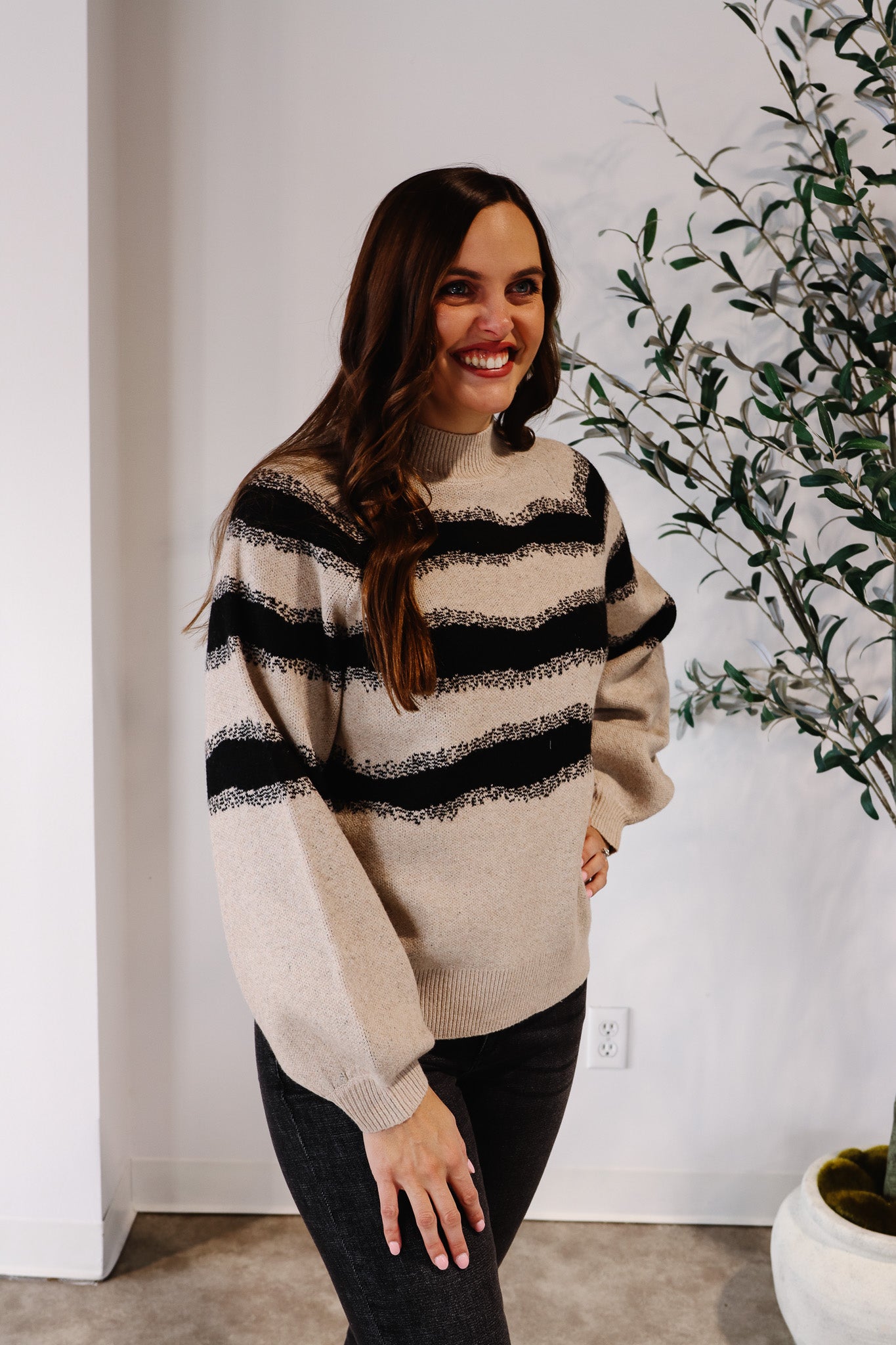 Cozy and chic—this striped jacquard-knit sweater features a round neckline, bishop sleeves, and a relaxed, easy fit.
