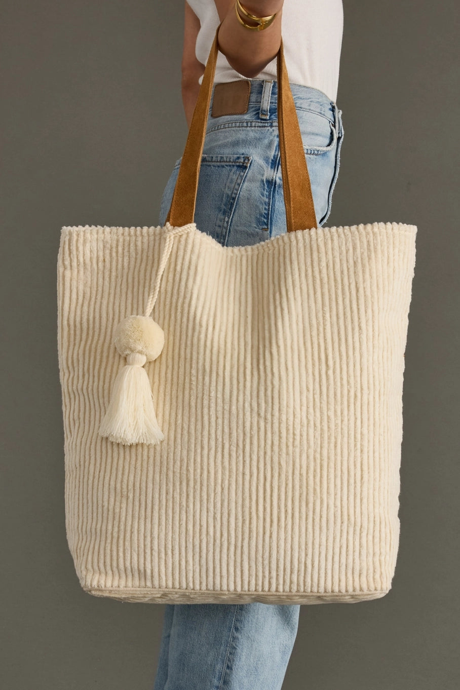Stylish and spacious, this 100% cotton tote features a cream corduroy texture and a playful pom tassel accent.