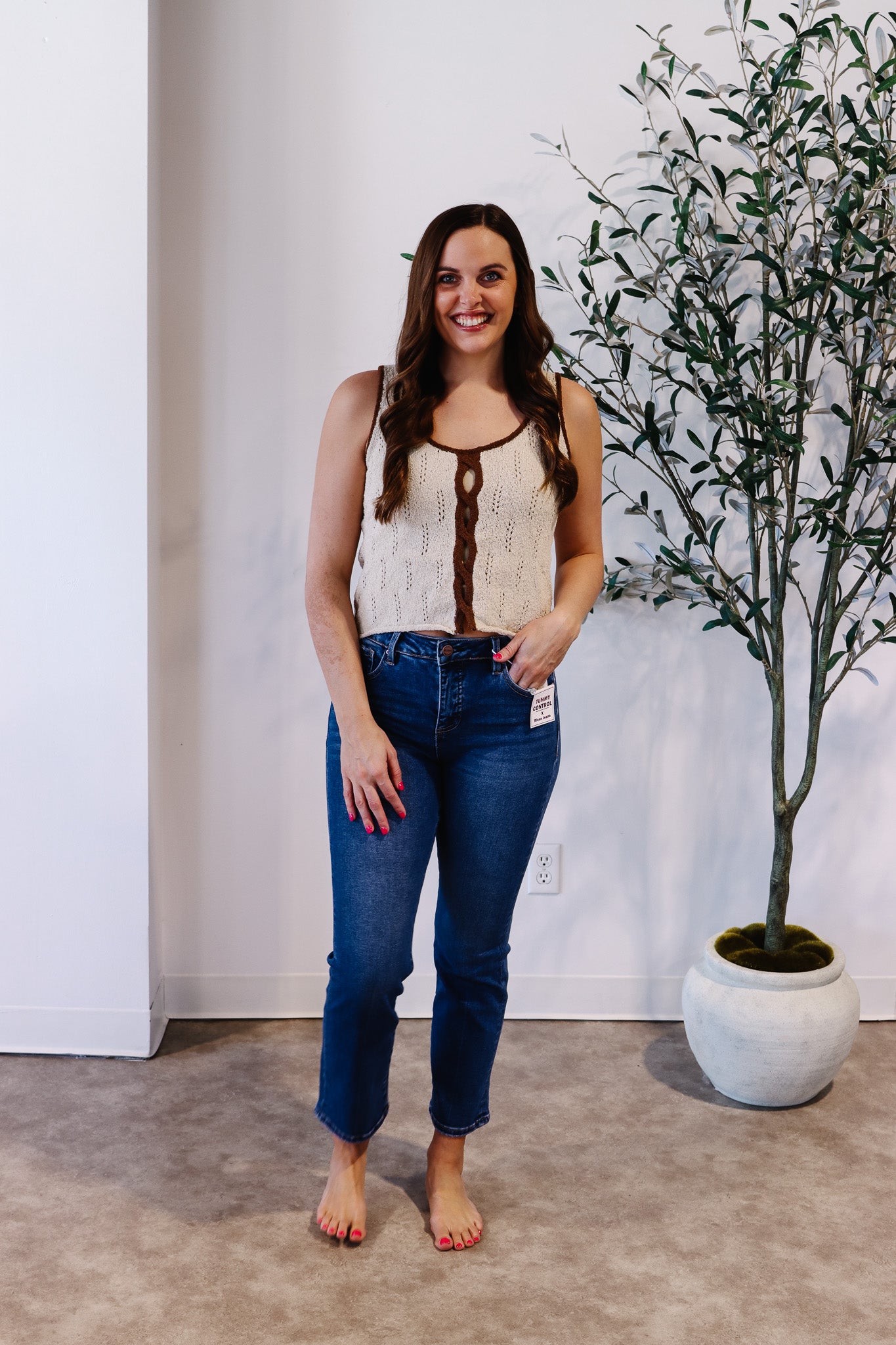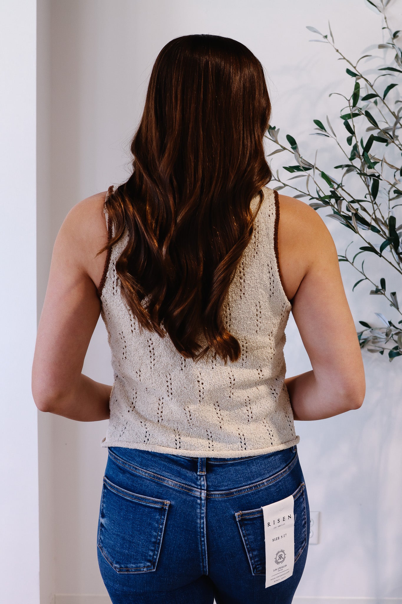 A chic textured pointelle-knit sweater tank featuring a scoop neckline with contrast trim, twist-front keyhole detail, and sleeveless silhouette for an elevated everyday look. Designed with a rolled hem, cropped length, and relaxed fit, it pairs perfectly with high-waisted denim, skirts, or trousers for effortless styling.