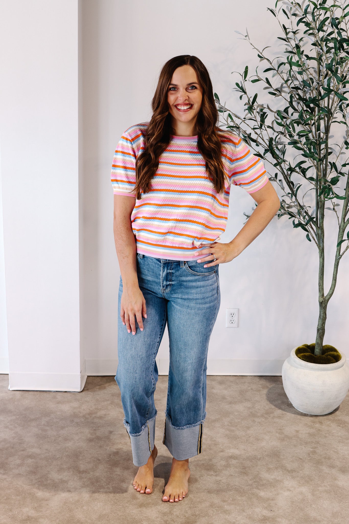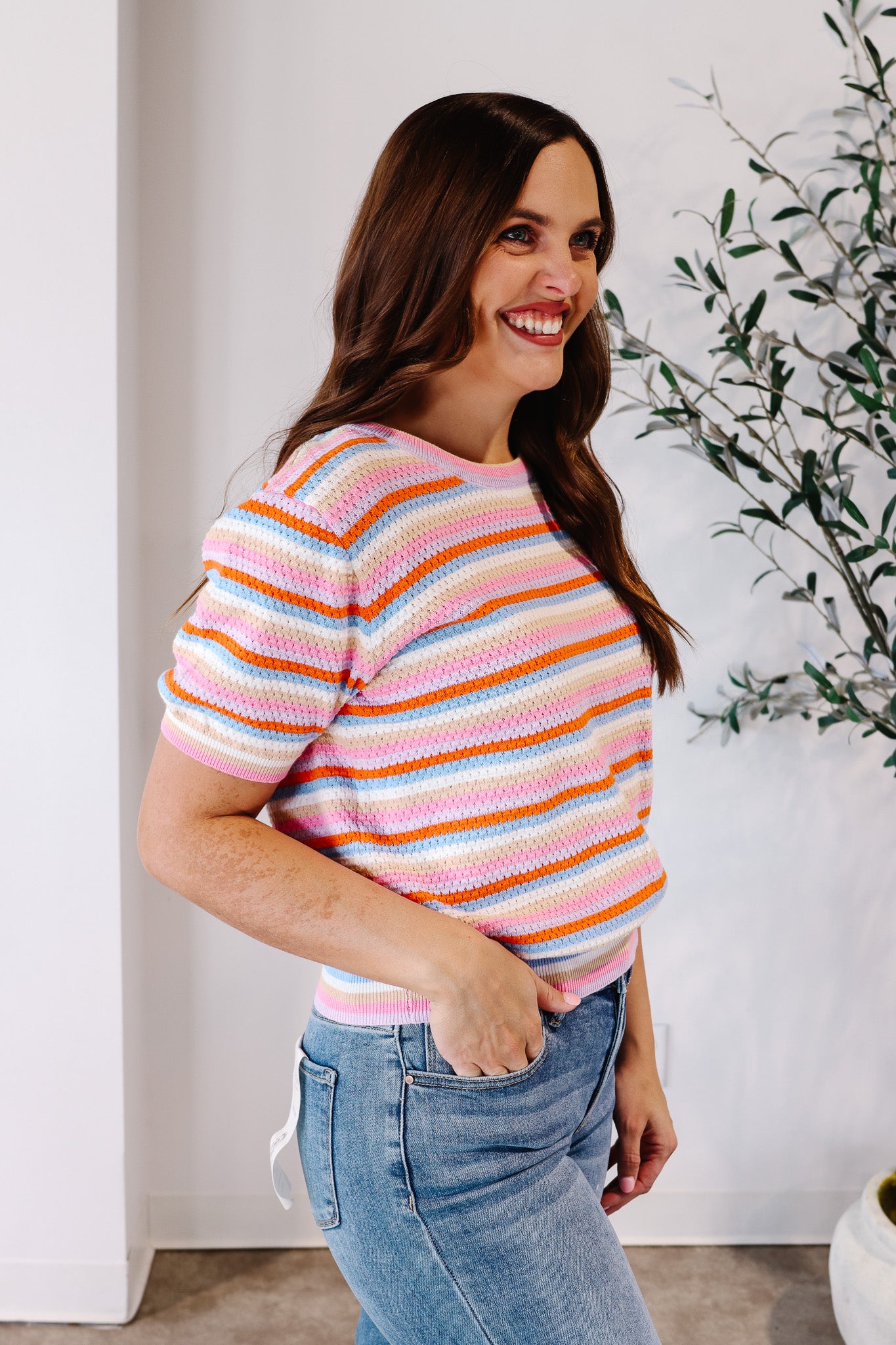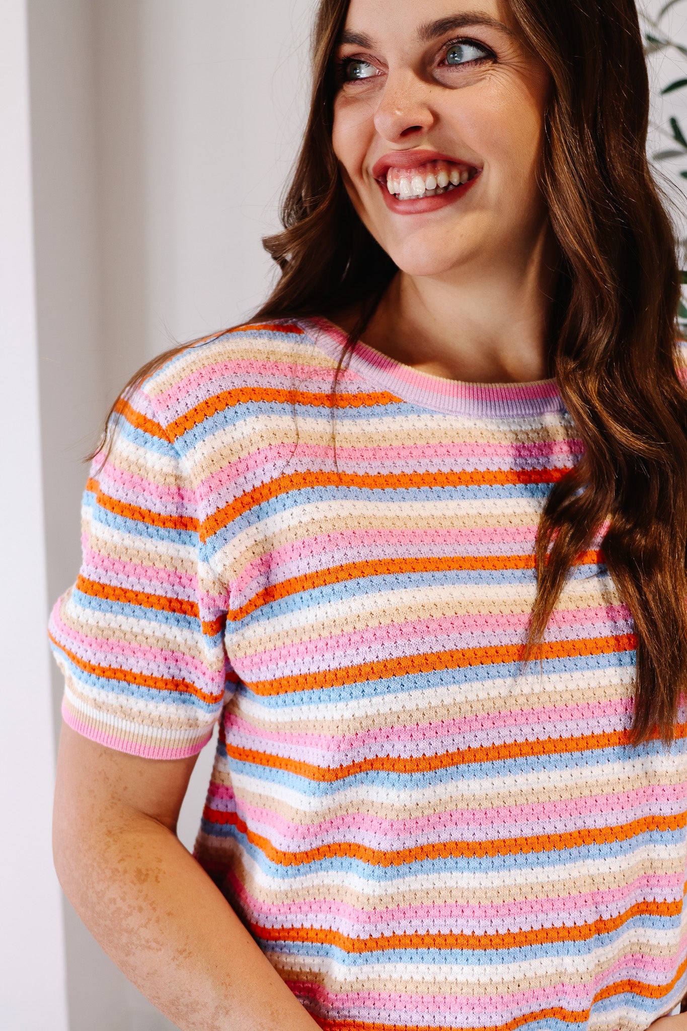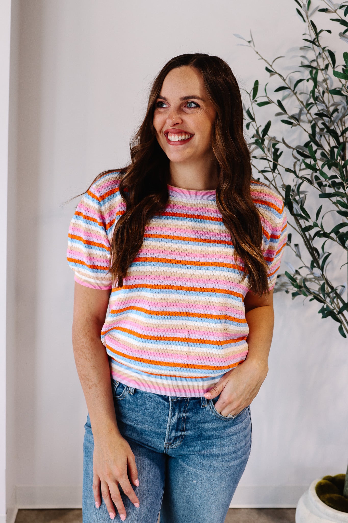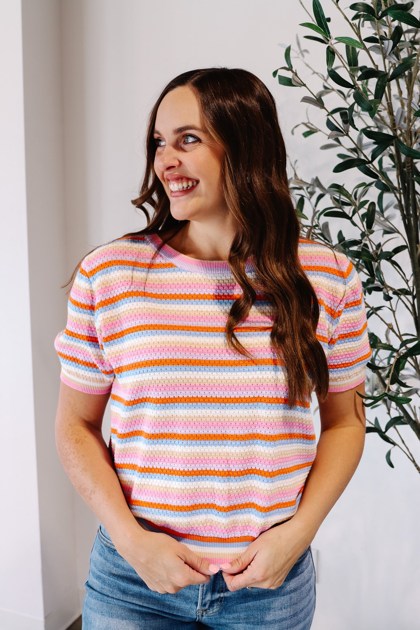 Bright, playful, and effortlessly comfy, the Sunset Sprinkle Knit Top brings cheerful color to your everyday style. Featuring delicate multicolor stripes in soft pastels and warm tones, this lightweight knit is finished with a classic round neckline and short sleeves for an easy, wear-anywhere look. Perfect for warm days when you still want that cozy knit feel.