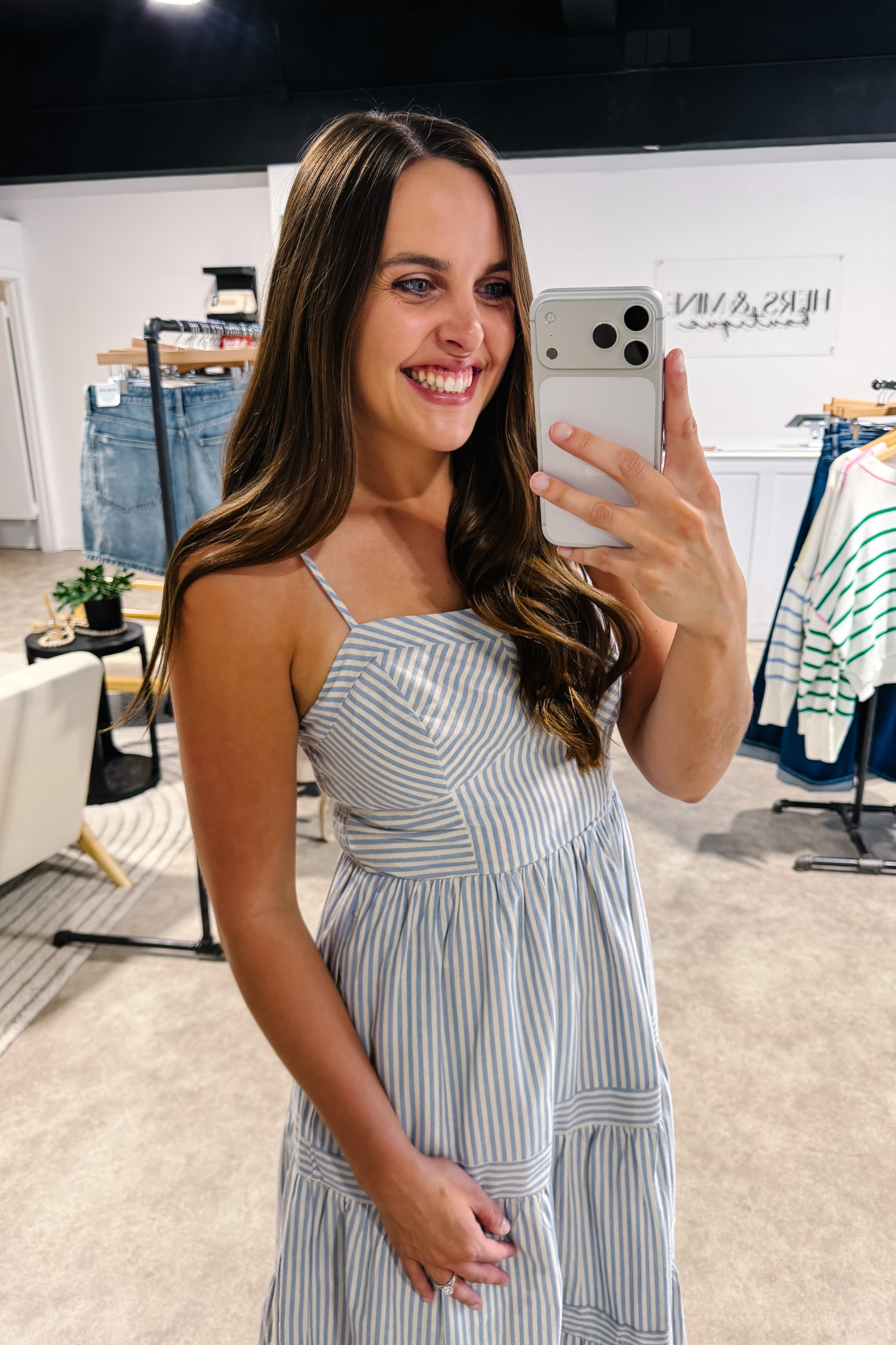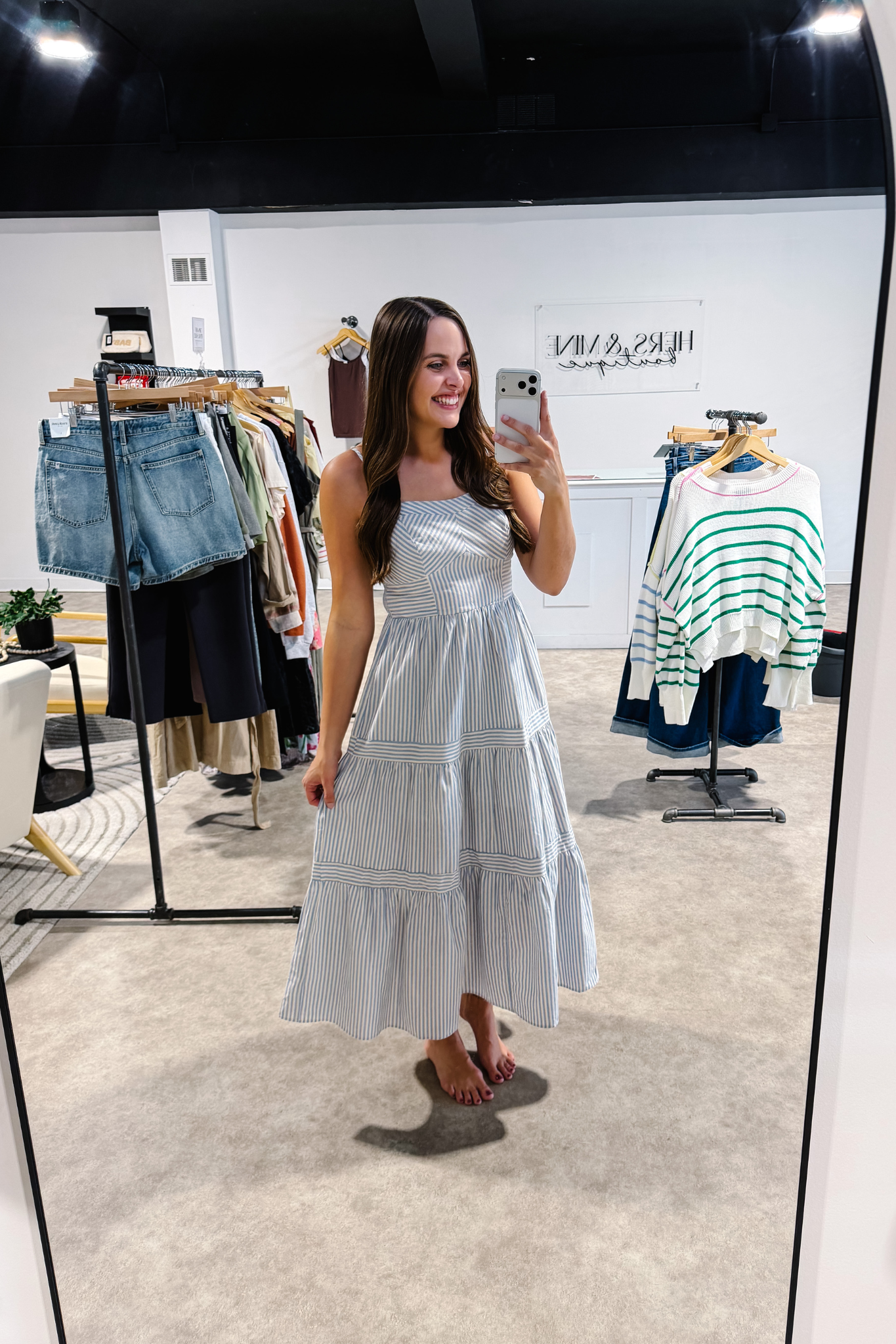 The Bluebell Stripe Tiered Midi Dress features a flattering sweetheart neckline and a fitted bodice with a comfortable smocked back for the perfect fit. Soft vertical stripes and a flowy tiered skirt create a breezy, feminine silhouette that moves beautifully with you. Lightweight and effortlessly chic, this dress is perfect for sunny days, brunch dates, or summer outings.