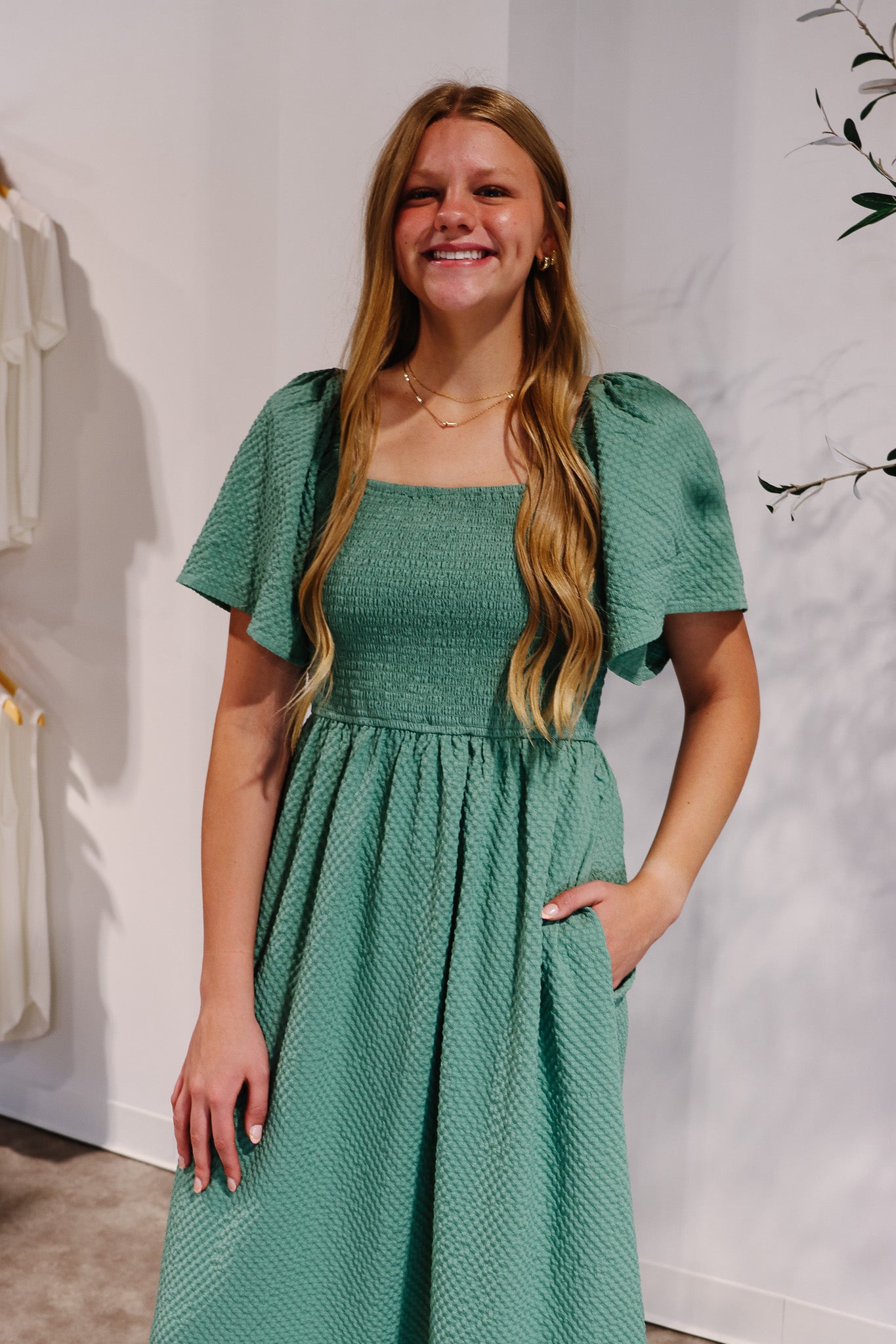 Our "Fawn Evergreen Maxi Dress" is maternity-friendly with stretchy, crinkled fabric and a smocked bust for comfort. Featuring a convertible off-the-shoulder design, square neck, flare sleeves, lining, and handy side pockets, this versatile maxi combines style and ease.