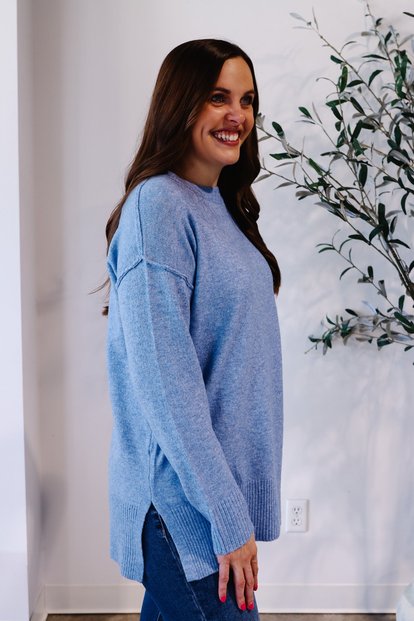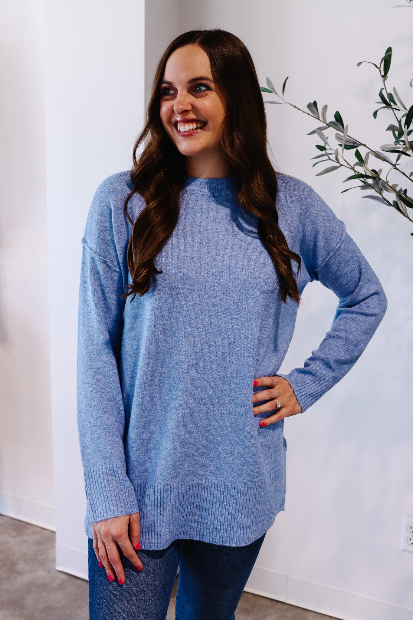 Say hello to your new cold-weather favorite—the Snow Day Sweater in a stunning blue hue. Designed with an oversized silhouette, crew neck, and tunic length, it drapes beautifully while keeping you warm. Side slits add that extra touch of comfort and versatility. With its soft acrylic-poly-spandex blend, this sweater is perfect for cozy days at home or stepping out in style.